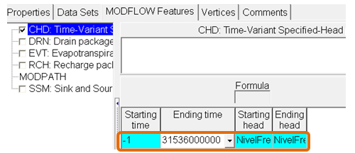 14. Now define times for objects that define the boundary conditions. Let’s start with “Botadero” (Waste dump), double click the object, then on MODFLOW Features we enter the following