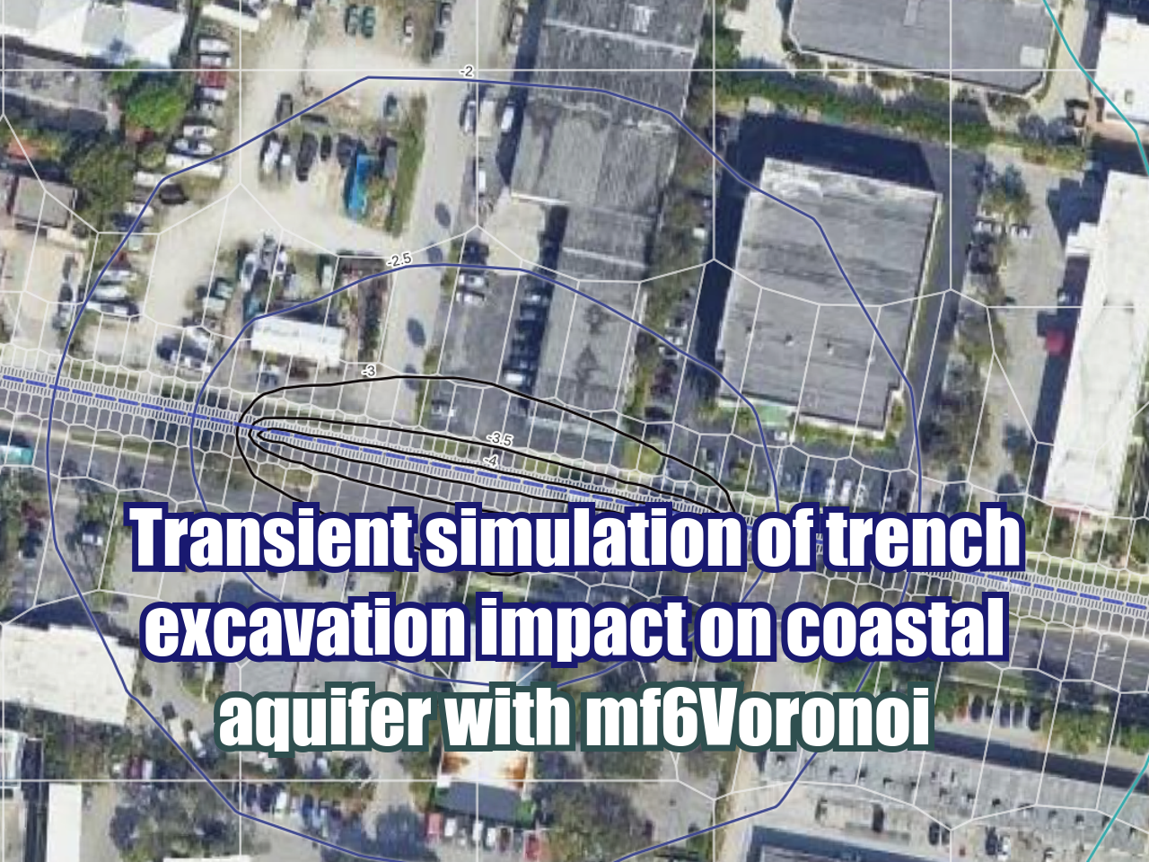 /Local scale modeling of a 4 stage trench excavation on a coastal aquifer with mf6Voronoi. The main objective of this modeling work is assessing the impact of the excavation on the nearby groundwater flow regime.